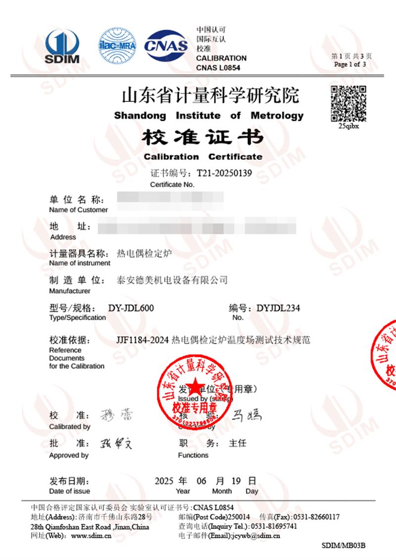 熱電偶檢定爐(300-1200℃)校準證書 2025-6-20 本文被閱讀 3783 次