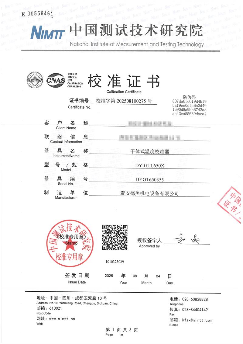 干體式溫度校準(zhǔn)器(40~650℃)校準(zhǔn)證書 2025-8-6 本文被閱讀 3494 次