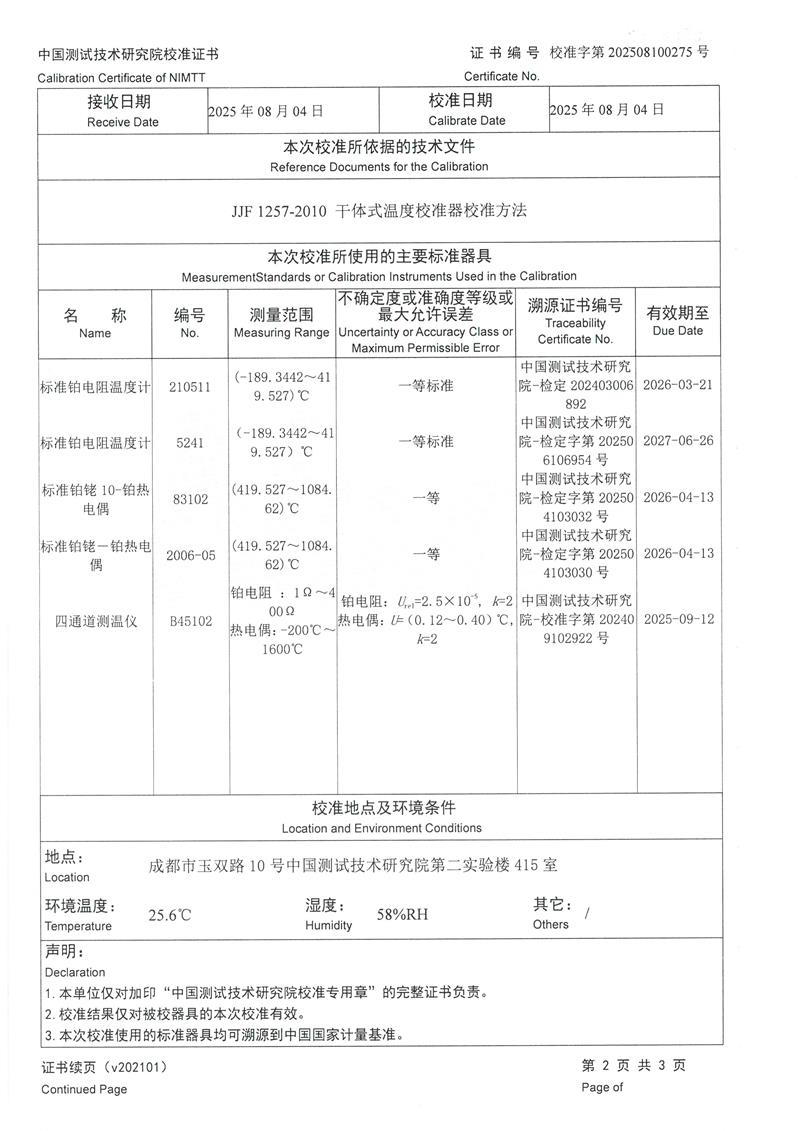 干體式溫度校準(zhǔn)器(40~650℃)校準(zhǔn)證書
