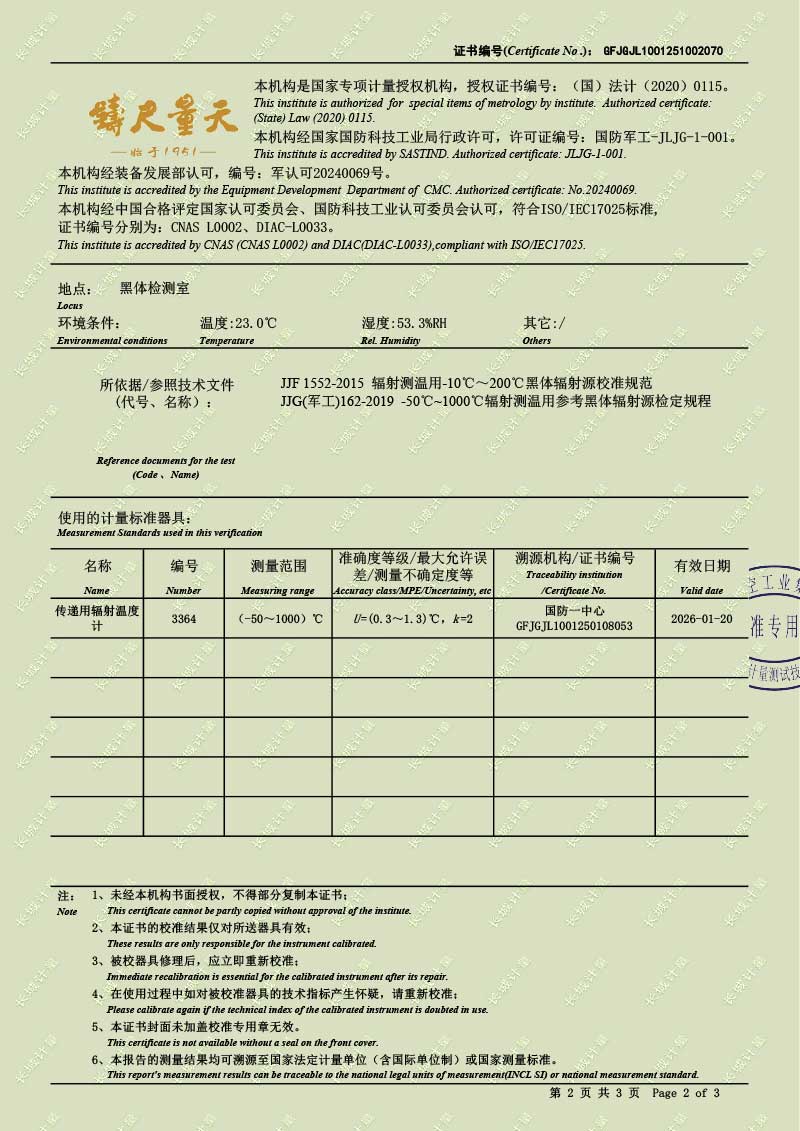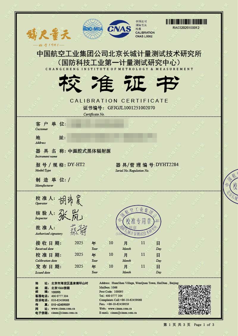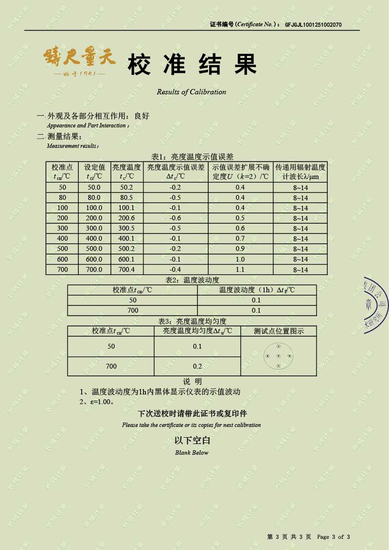 | 上一條:高溫腔式黑體輻射源(700-1600℃)校準(zhǔn)證書 | 下一條:中溫面源黑體爐-校準(zhǔn)證書 |