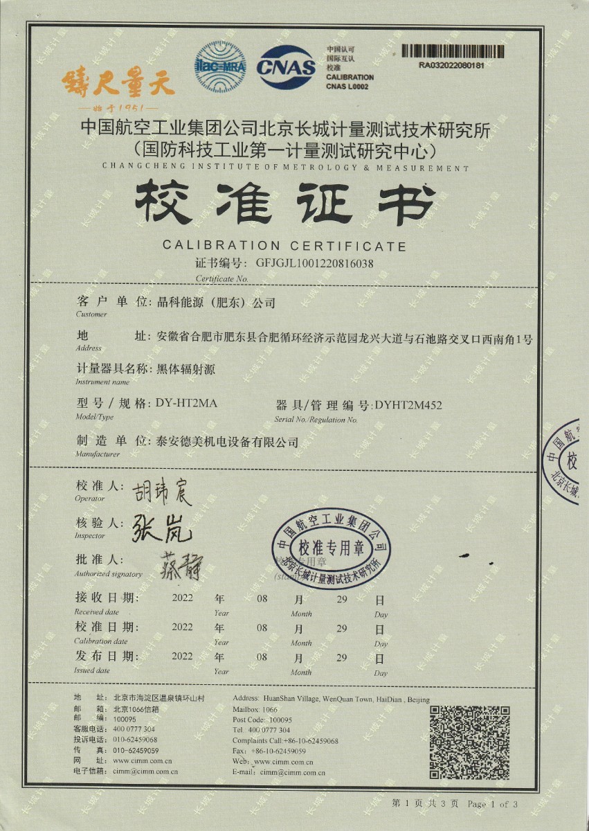晶科能源(肥東)公司-黑體輻射源 2022-9-5 本文被閱讀 13784 次