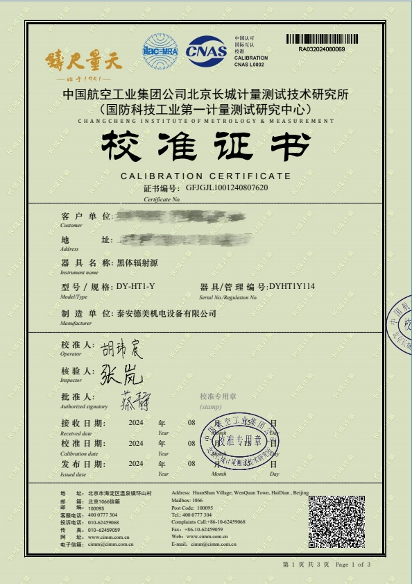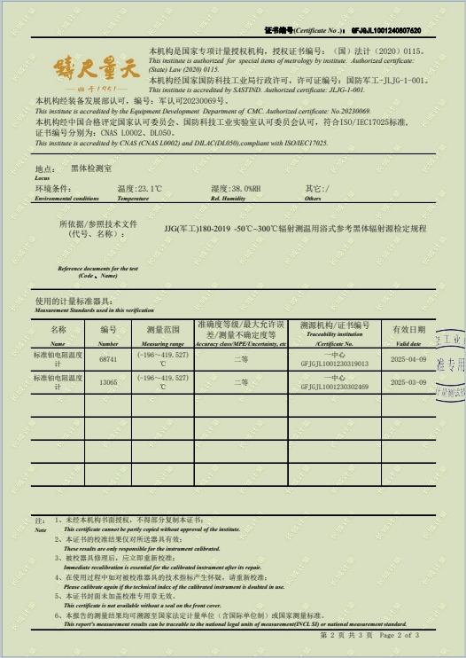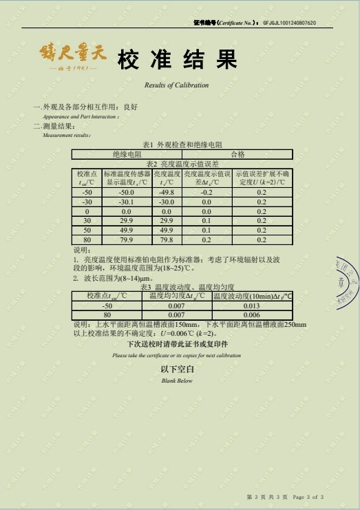 黑體輻射源-(-50~80(100℃))校準證書 2024-8-29 本文被閱讀 8405 次