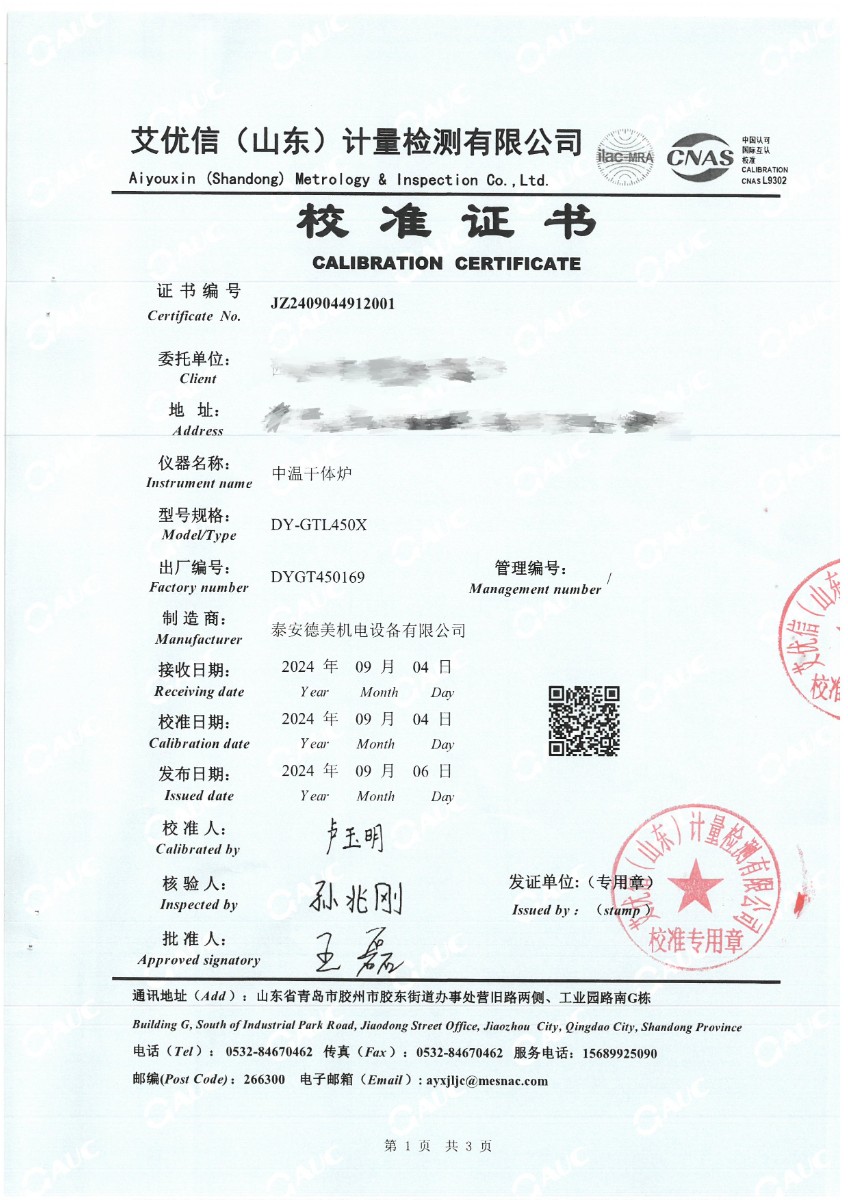 中溫干體(50~450℃)校準證書 2024-9-18 本文被閱讀 7027 次
