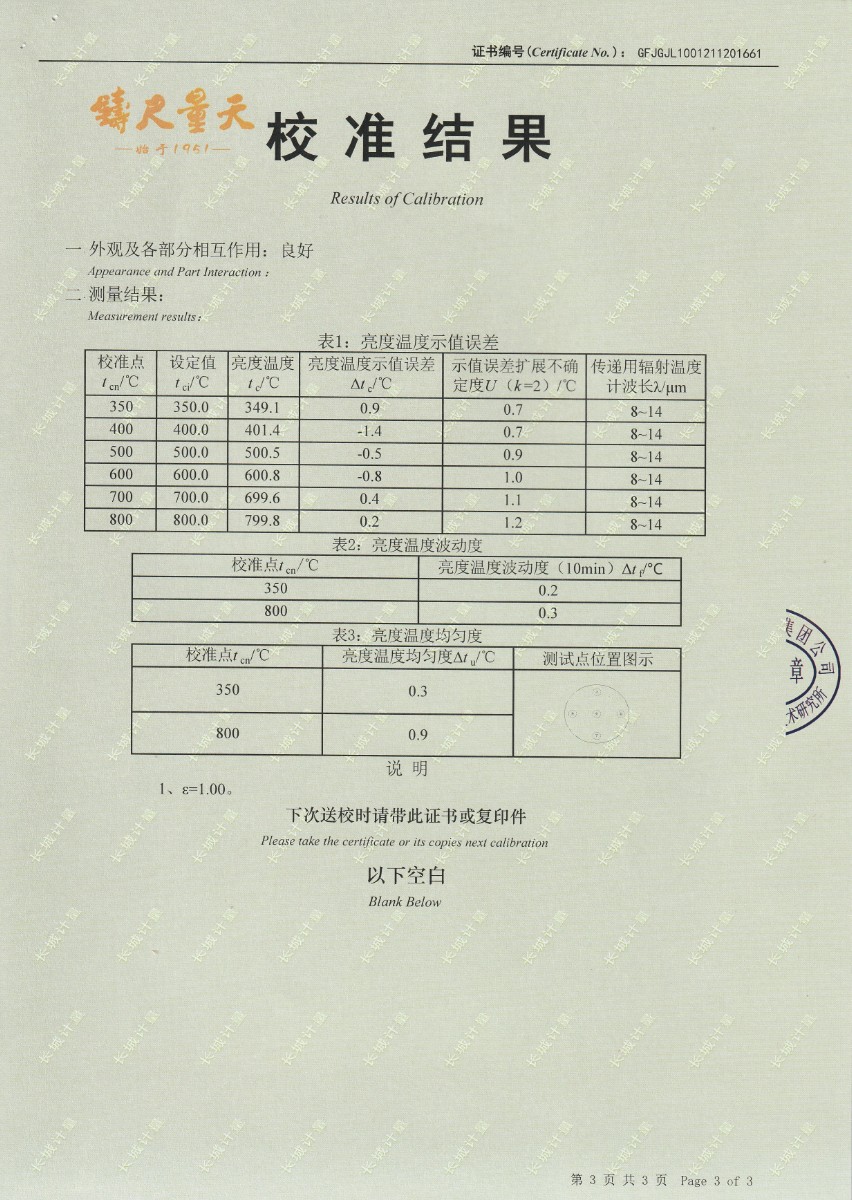 | 上一條:南京理工大學(xué)-黑體輻射源校準(zhǔn)證書300℃ | 下一條:中溫面源黑體爐-校準(zhǔn)證書 |