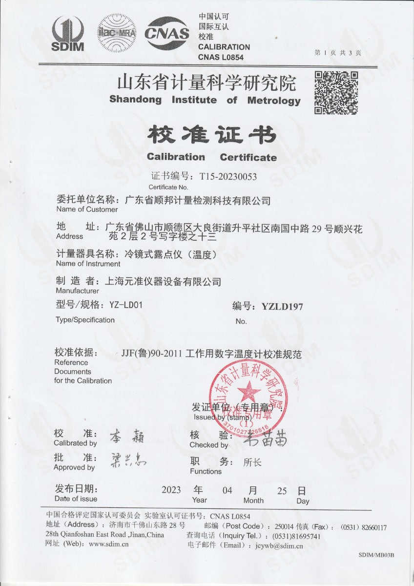 廣東省順邦計量檢測科技有限公司 冷鏡式露點儀(溫度) 校準證書 2023-5-4 本文被閱讀 10136 次