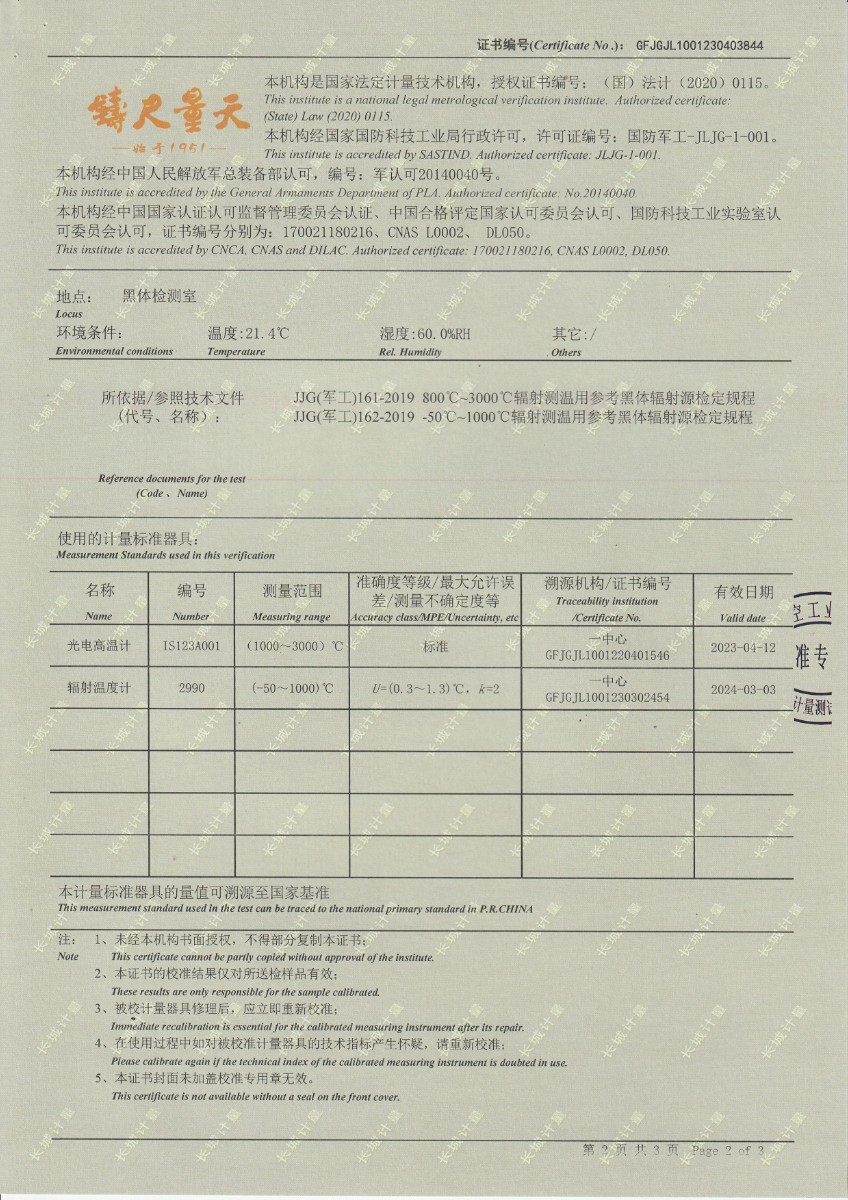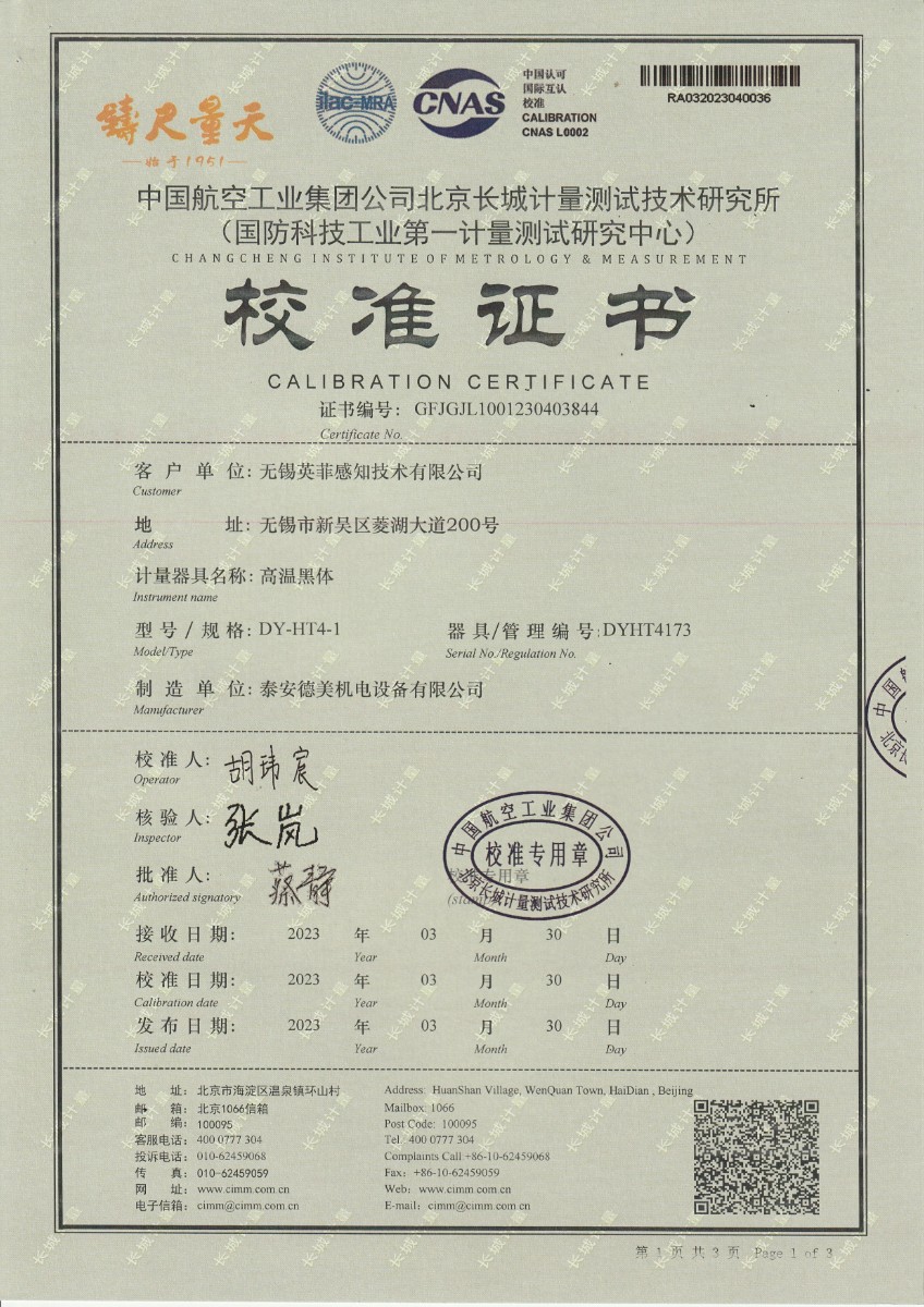 無錫英菲感知技術(shù)有限公司 高溫黑體 校準(zhǔn)證書 (2) 2023-5-4 本文被閱讀 12088 次