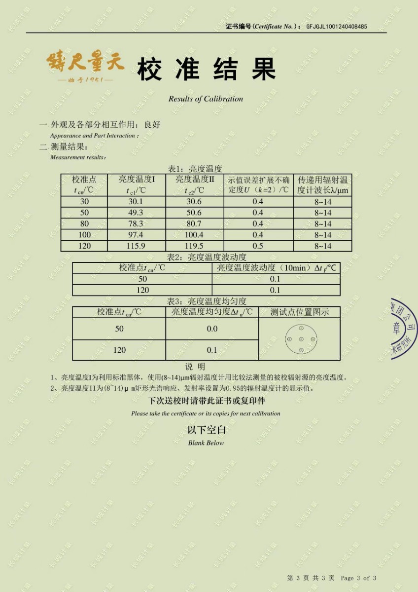 小尺寸高精度中溫黑體校準證書