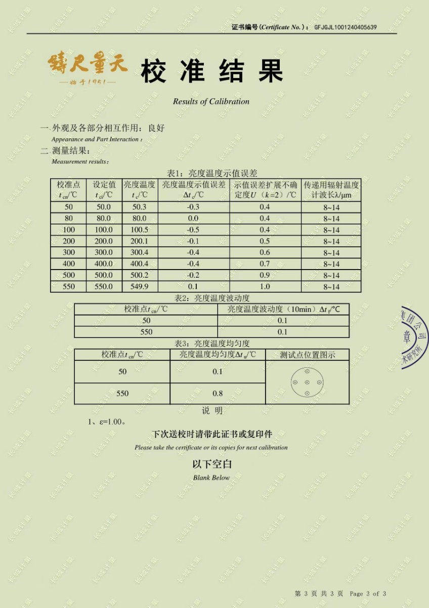 黑體爐校準(zhǔn)證書 2024-4-24 本文被閱讀 10114 次