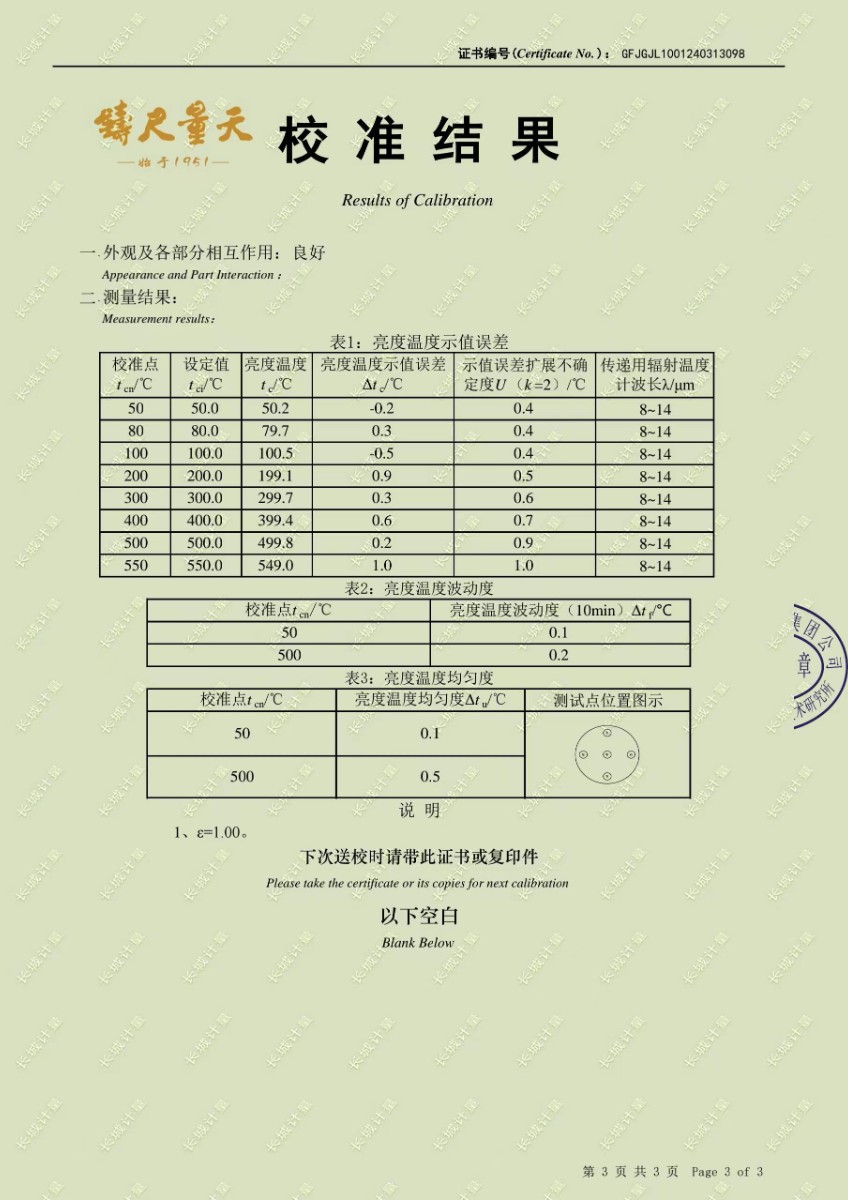 黑體輻射源校準(zhǔn)證書 2024-4-11 本文被閱讀 7034 次