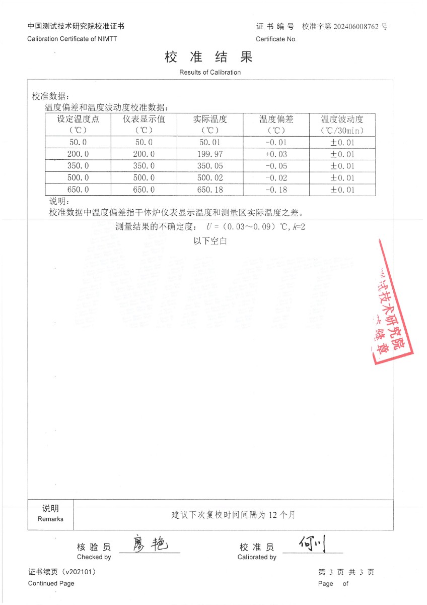 | 上一條:中溫干體爐295(50~650℃)校準(zhǔn)證書(shū) | 下一條:中溫面源黑體爐-校準(zhǔn)證書(shū) |