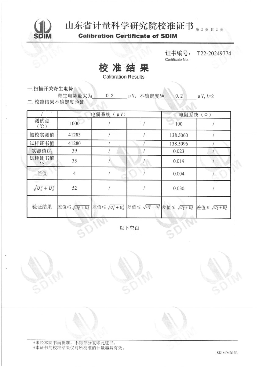 熱電偶、熱電阻自動檢測系統(tǒng)校準證書
