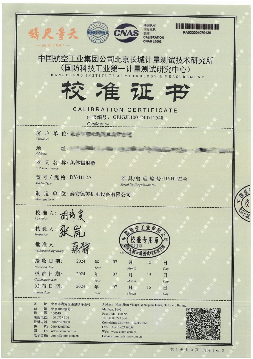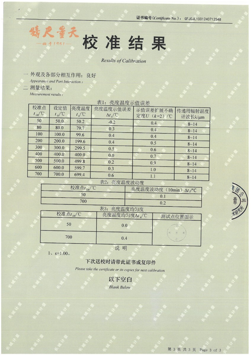 黑體(50~700℃)校準(zhǔn)證書 2024-7-29 本文被閱讀 10791 次