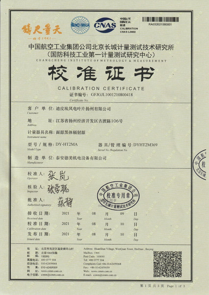 迪皮埃風電葉片揚州有限公司-面源黑體輻射源 2021-8-21 本文被閱讀 17526 次