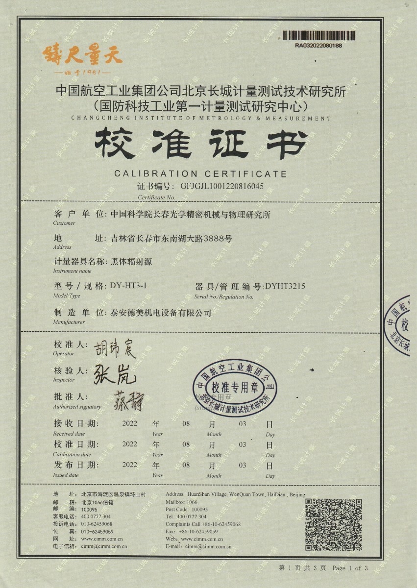 中國科學院長春光學精密機械與物理研究所-黑體爐DY-HT3-1 2022-9-5 本文被閱讀 13348 次