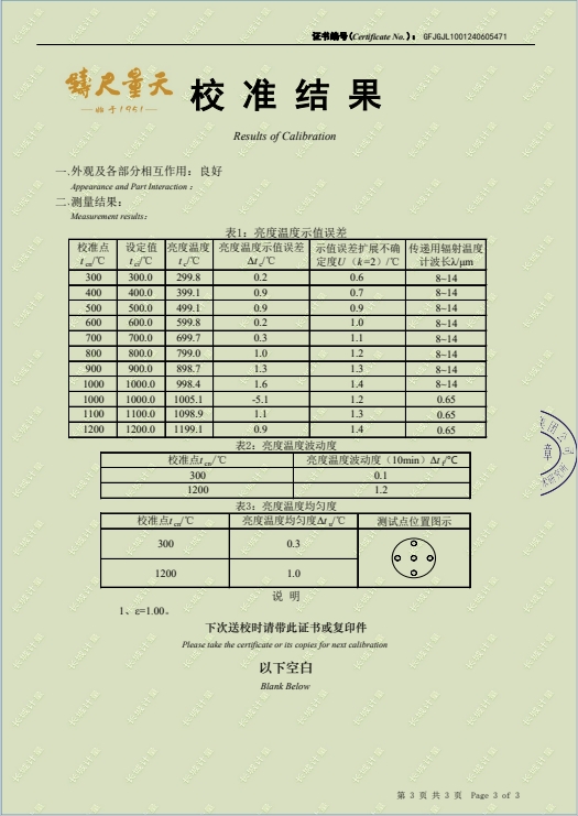 | 上一條:冷鏡式露點(diǎn)儀(-20-95℃)檢定證書(shū) | 下一條:中溫面源黑體爐-校準(zhǔn)證書(shū) |