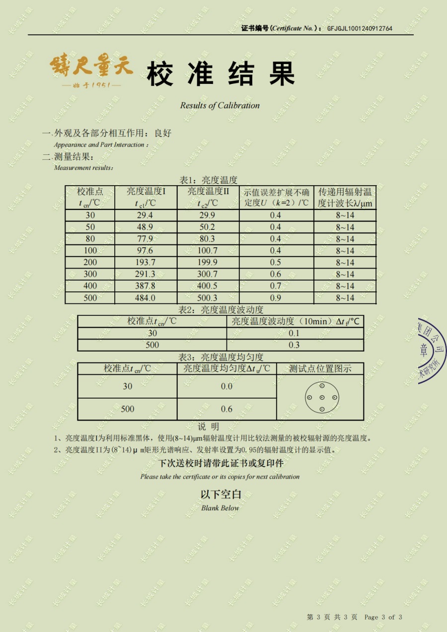 面源黑體爐(室溫+5-500℃)校準證書 2024-10-17 本文被閱讀 6701 次