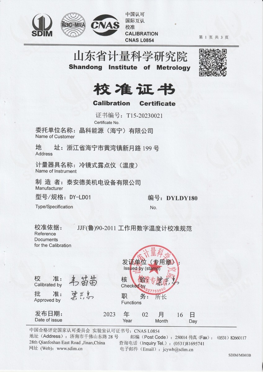 | 上一條:晶科能源(海寧)有限公司 冷鏡式露點(diǎn)儀 檢定證書 | 下一條:低溫干體爐-校準(zhǔn)證書 |