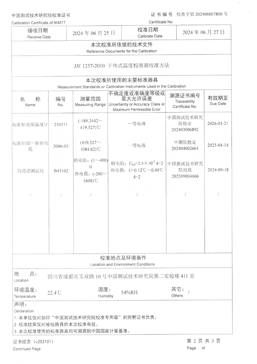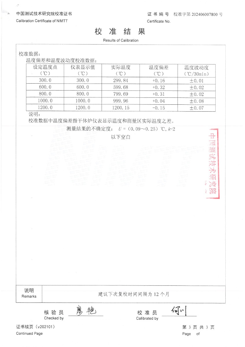 高溫干體爐(300~1200℃)校準(zhǔn)證書 2024-7-1 本文被閱讀 6600 次