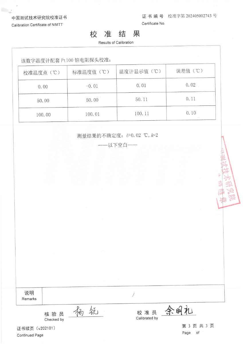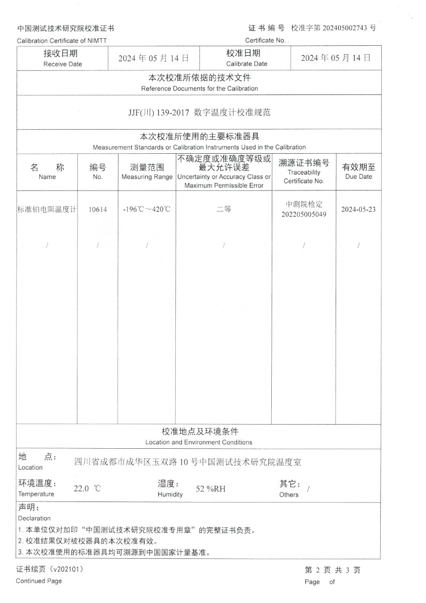 手持式高精度數字溫度計校準證書 2024-5-18 本文被閱讀 7165 次