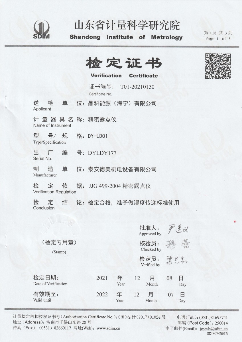 | 上一條:安徽晶科能源有限公司-精密露點(diǎn)儀(溫度) | 下一條:中溫面源黑體爐-校準(zhǔn)證書 |