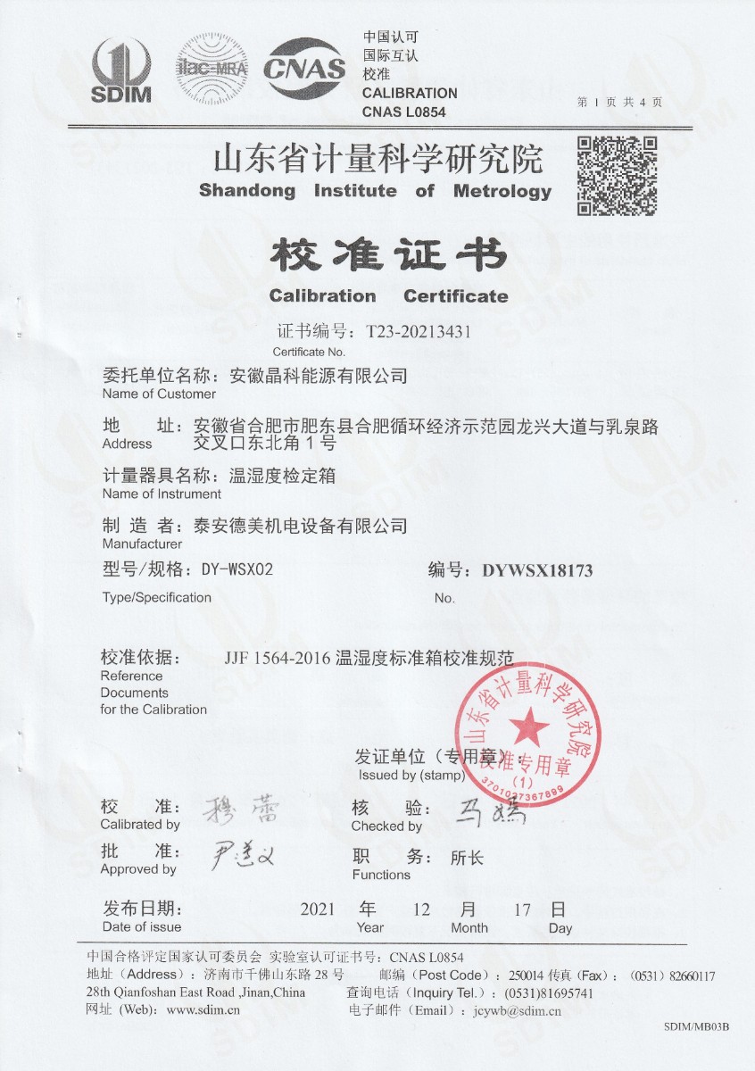 安徽晶科能源有限公司-溫濕度檢定箱 2021-12-30 本文被閱讀 15557 次