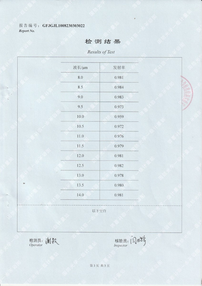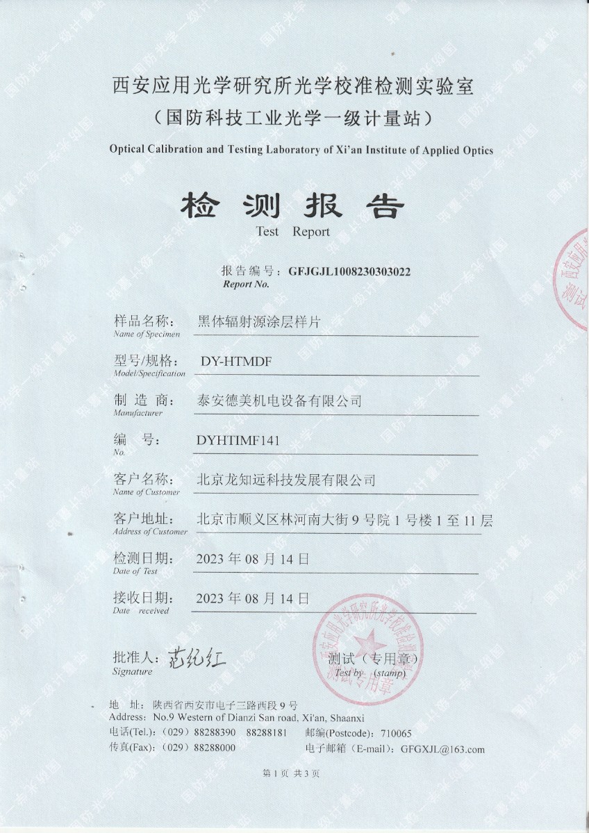 | 上一條:北京龍知遠(yuǎn)科技發(fā)展有限公司-黑體輻射源涂層樣片DYHT1MF140檢測(cè)報(bào)告 | 下一條:中溫面源黑體爐-校準(zhǔn)證書(shū) |