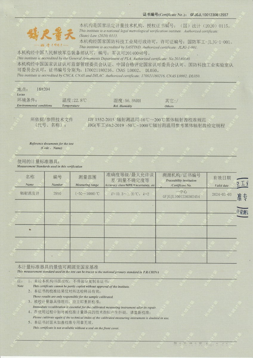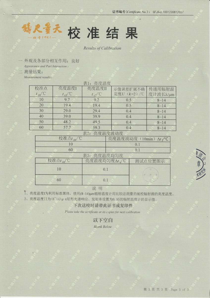 面源黑體爐DYHT1M141校準證書 2023-9-20 本文被閱讀 9660 次