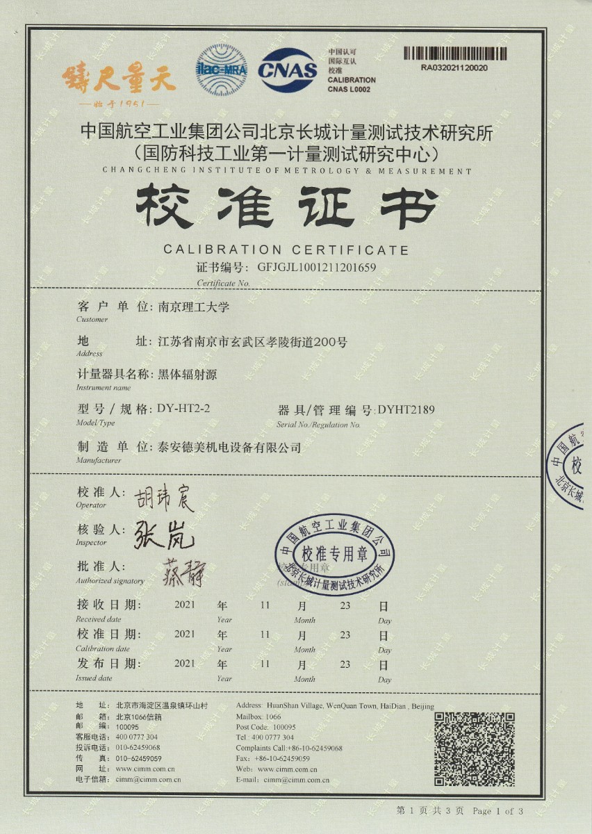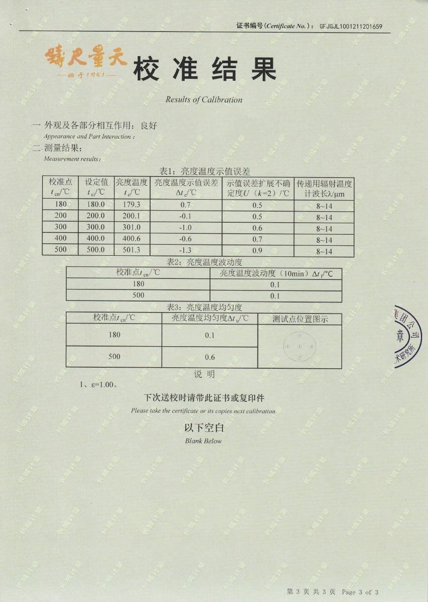 | 上一條:南京理工大學(xué)-黑體輻射源校準(zhǔn)證書40-250℃ | 下一條:中溫面源黑體爐-校準(zhǔn)證書 |